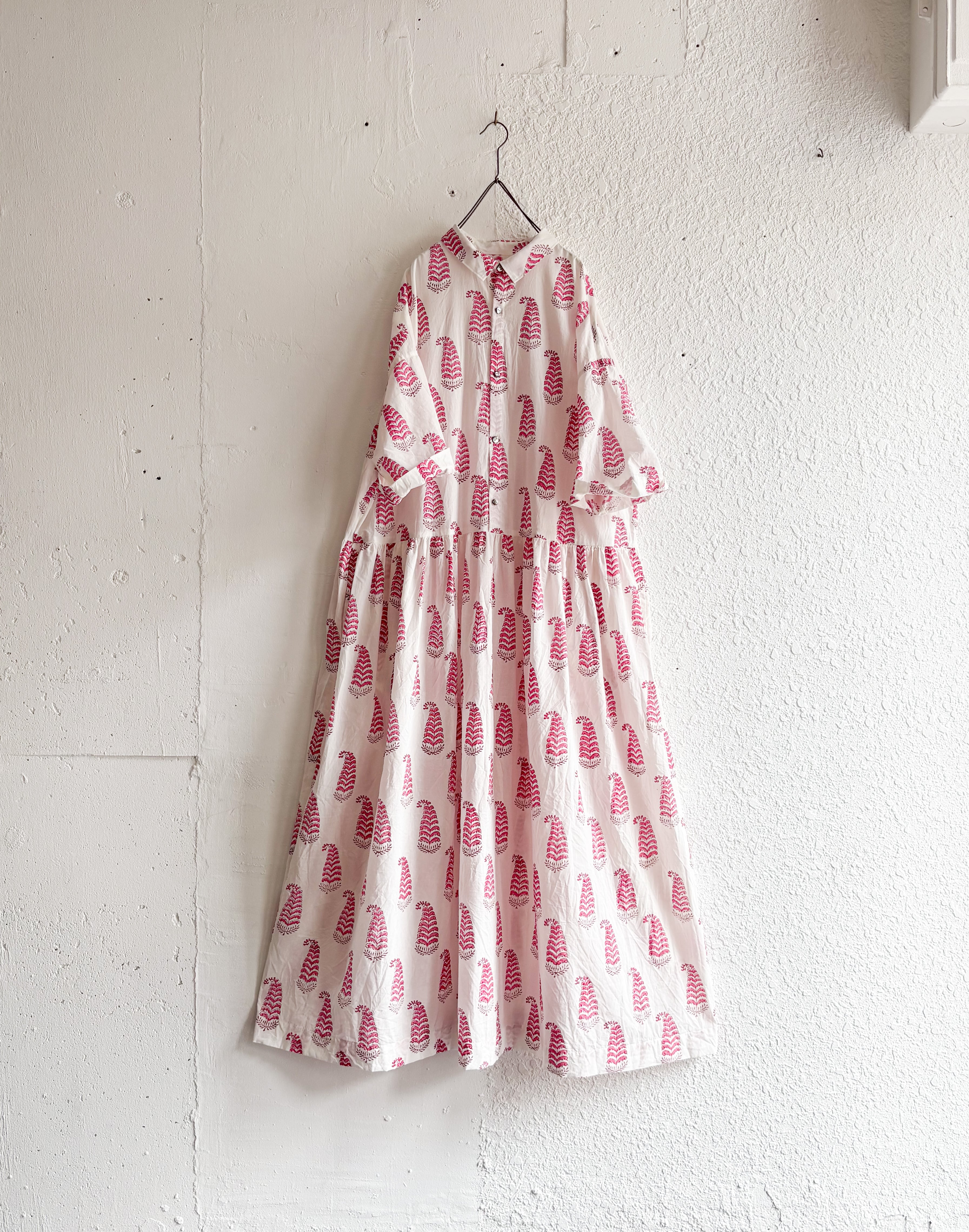 なんとも言えないかわいいプリントでお馴染みのインドのブロックプリントの生地で半袖のプルオーバーギャザーワンピースをお作りしました!