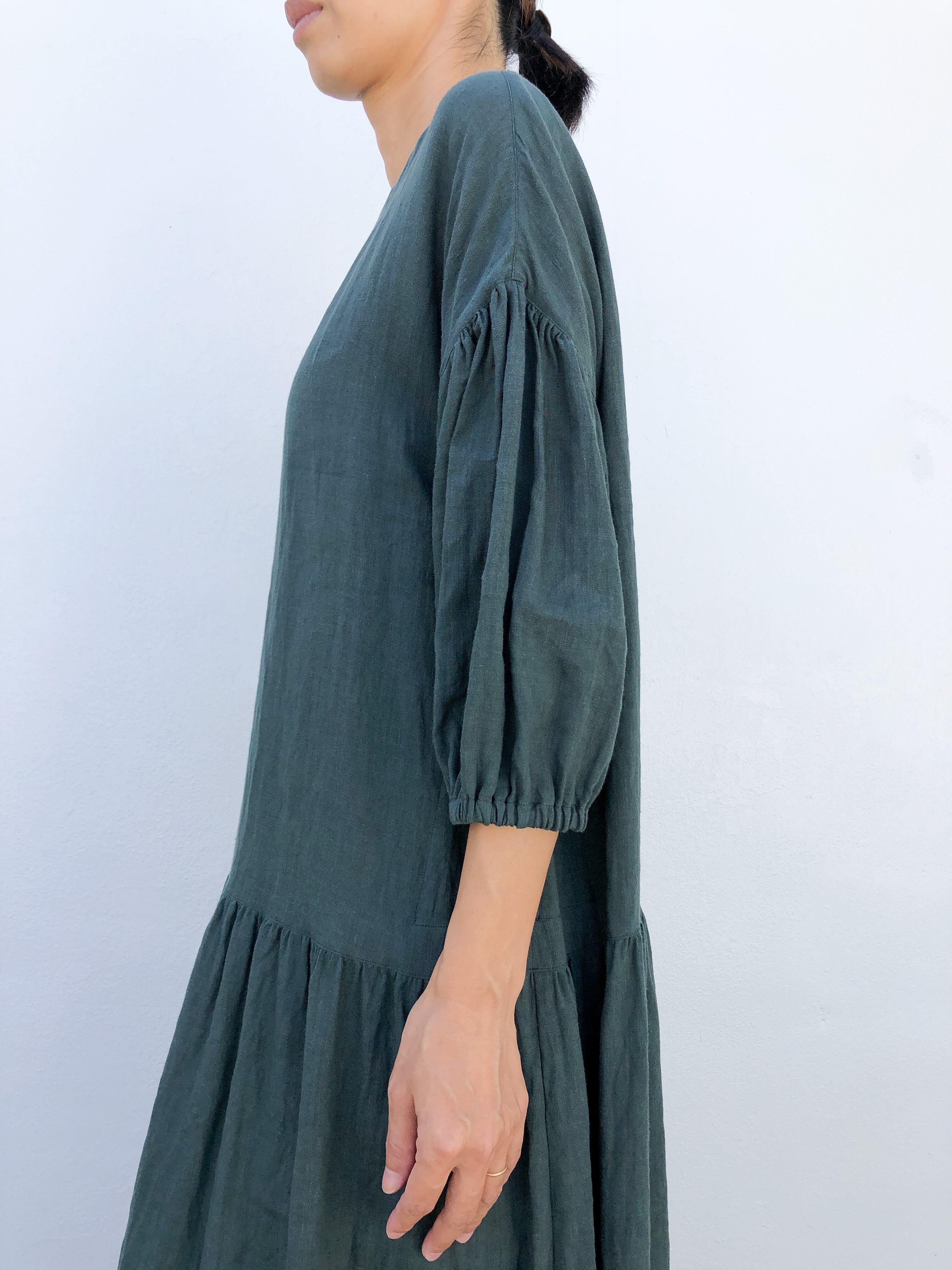 低めのウエスト切り替えからギャザーを寄せたシンプルなワンピースに、袖口にゴムを入れた半袖のパフスリーブをつけた素敵なパフスリーブギャザーワンピースです。袖を伸ばせば5分袖として、ゴムを入れた袖口をキュッと上に上げれば半袖として楽しめます。