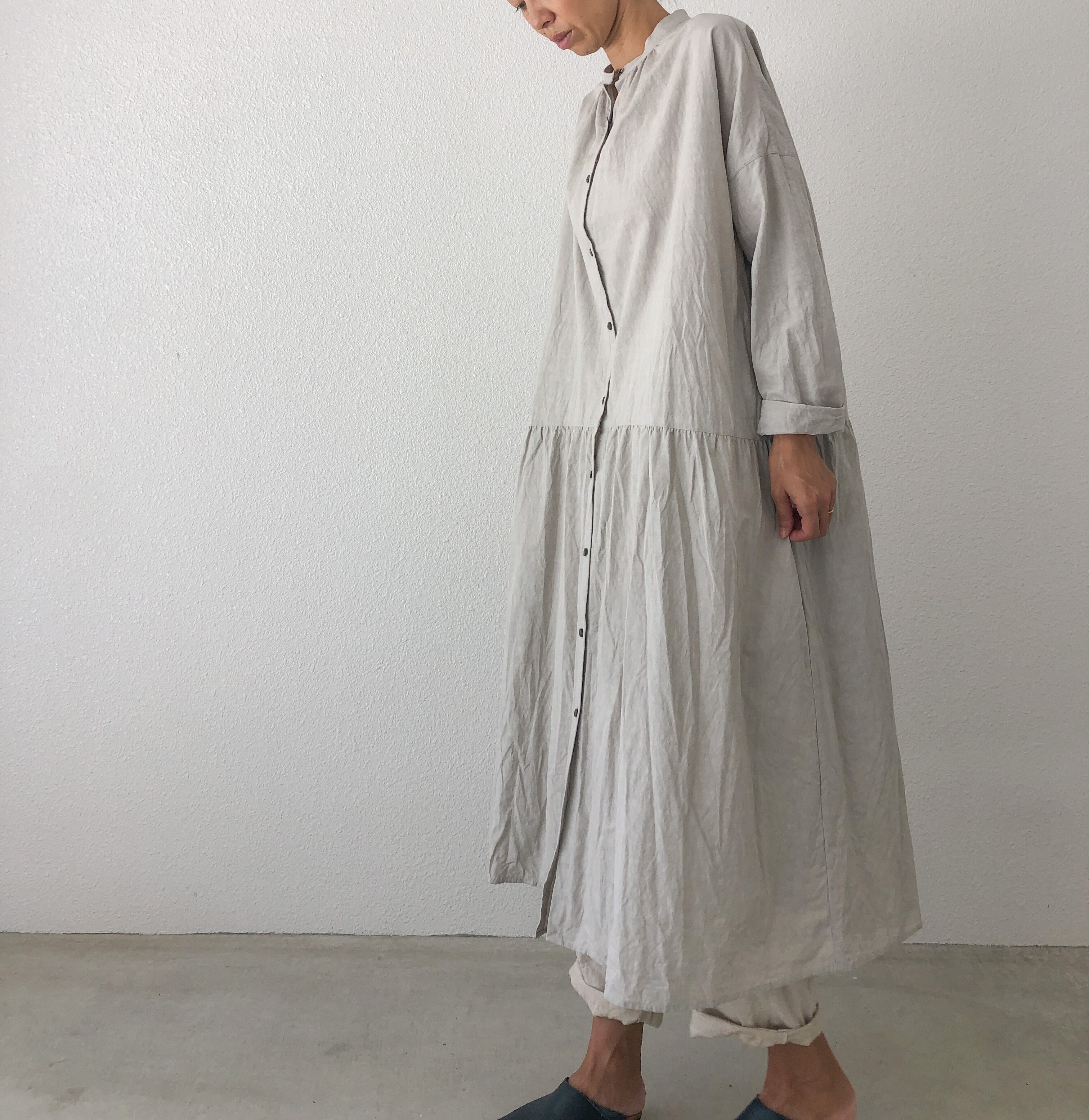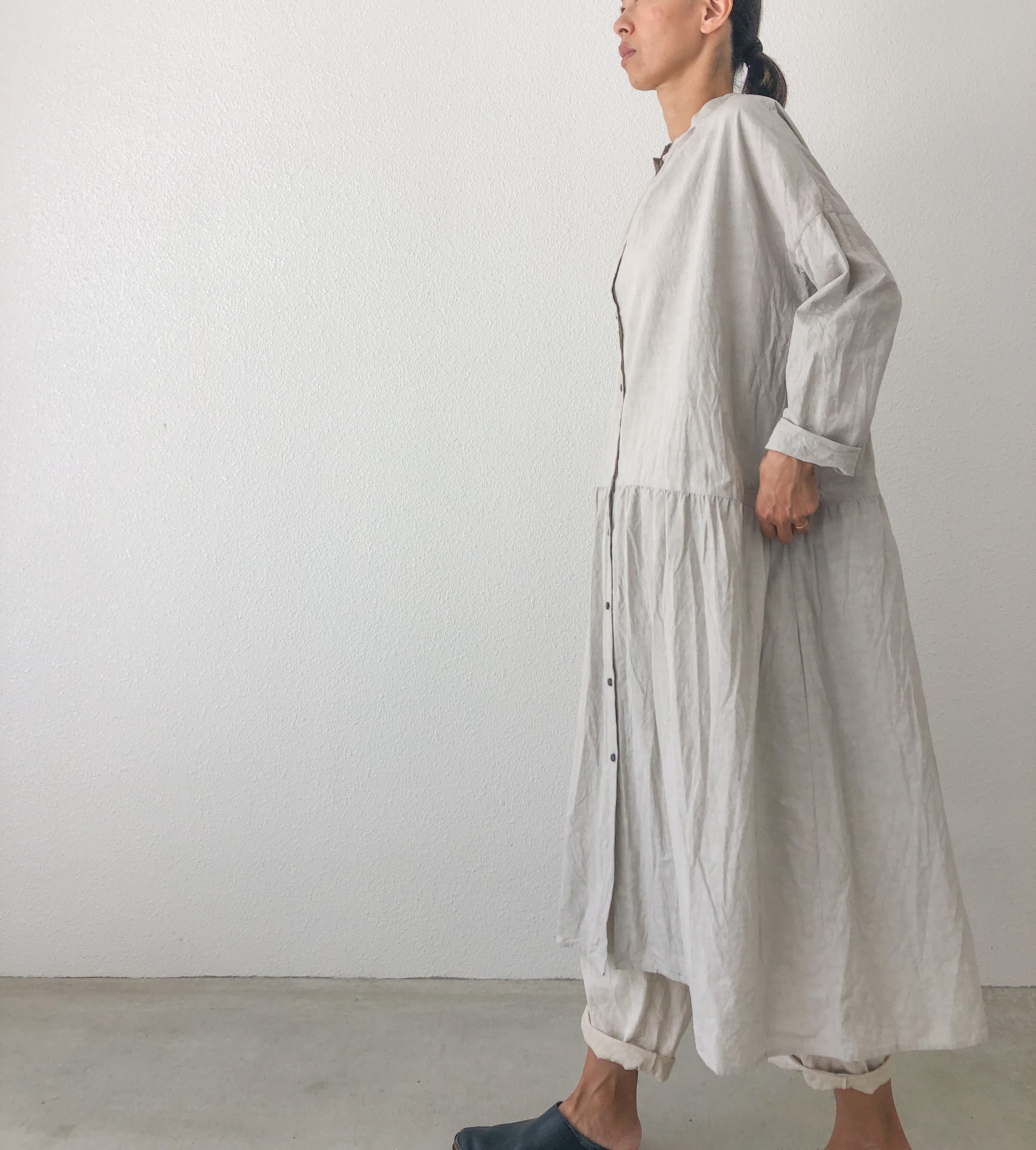 ヘンプコットンのファナージュ素材を使用したシャツワンピースです。ロング丈のシャツワンピースは、ワンピースとしてはもちろん羽織り物としても活躍してくれます!暑かったり寒かったりする季節に使いやすい1枚。ボトムにはデニムを合わせたり、スカートを合わせたりとコーディネイトの幅も広いので着回しが利くワードローブとして大活躍してくれそうです!