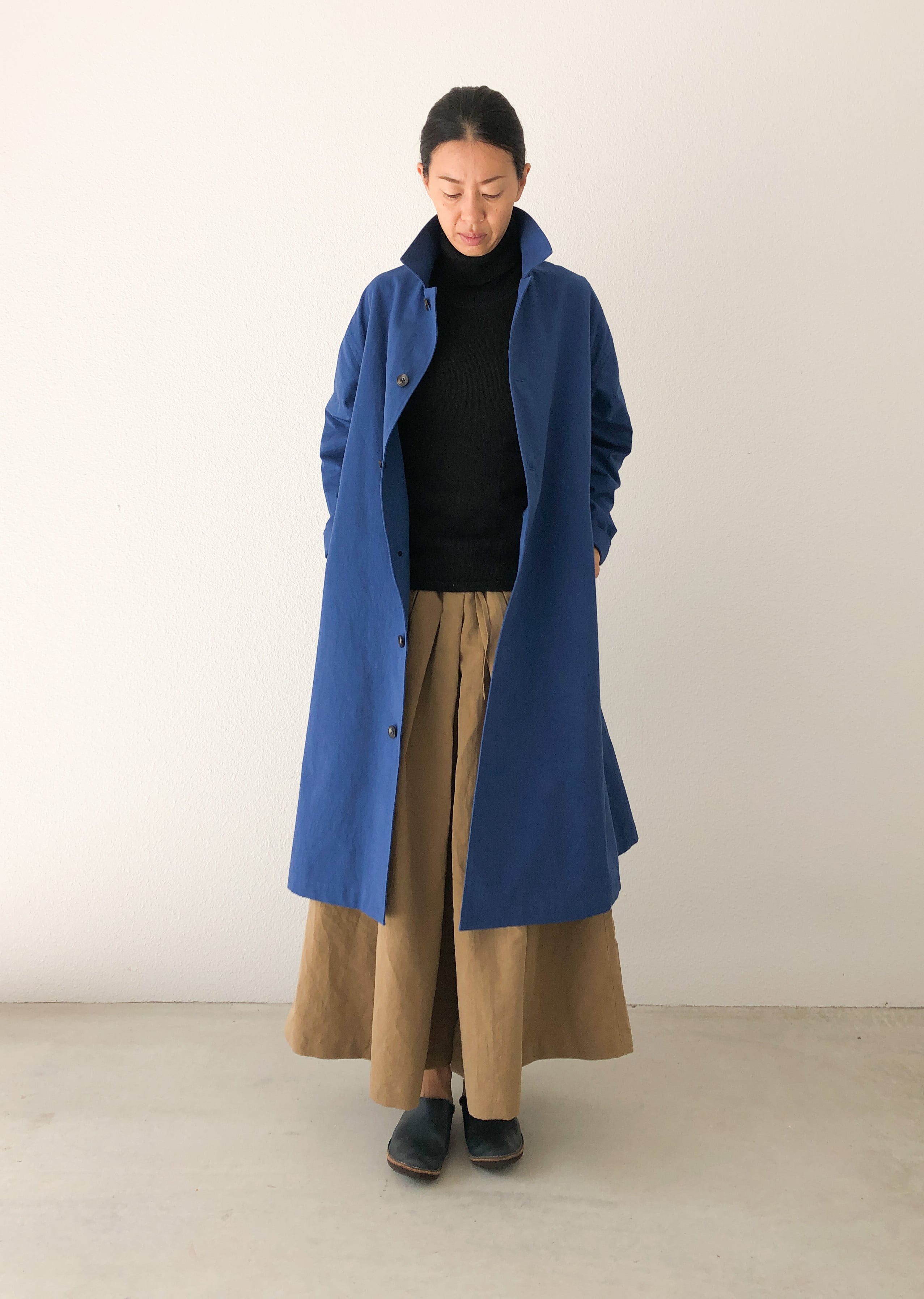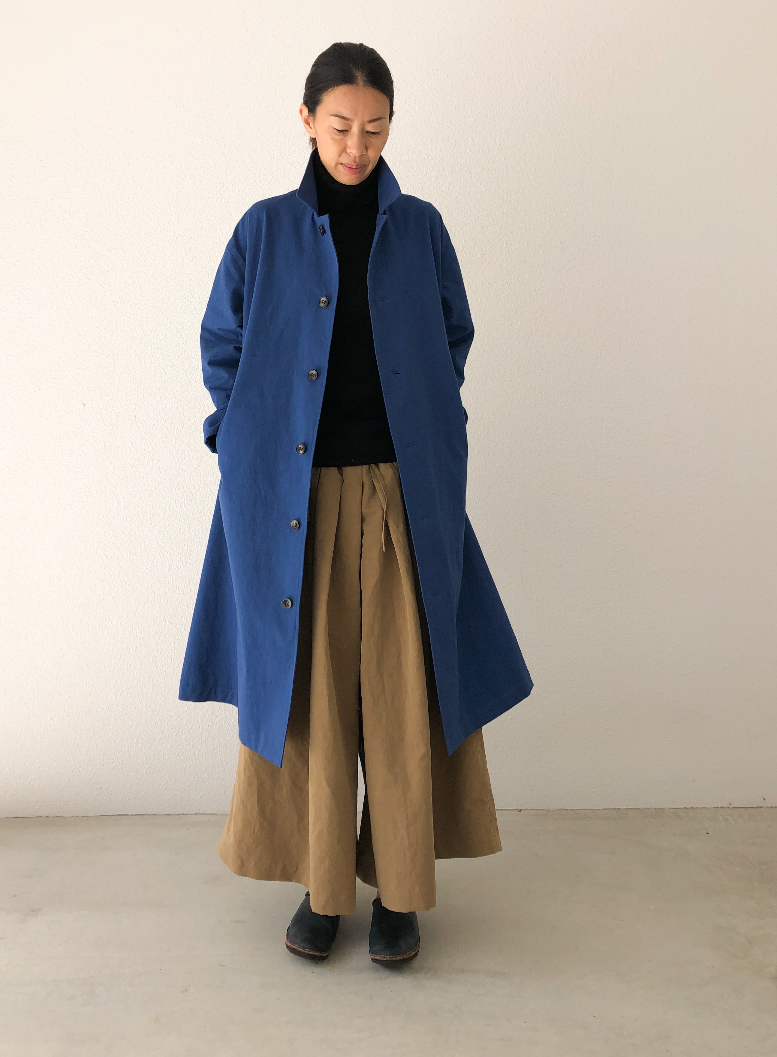 コットンポプリンとは織地が密で特有の光沢感が有り、さらに風合いが良く着心地の良い素材です。シンプルなデザインに表情のある素材を組み合わせて、着る度洗濯する度に表情が少しずつ変わりまた次も着たくなるコートに仕上がっています。