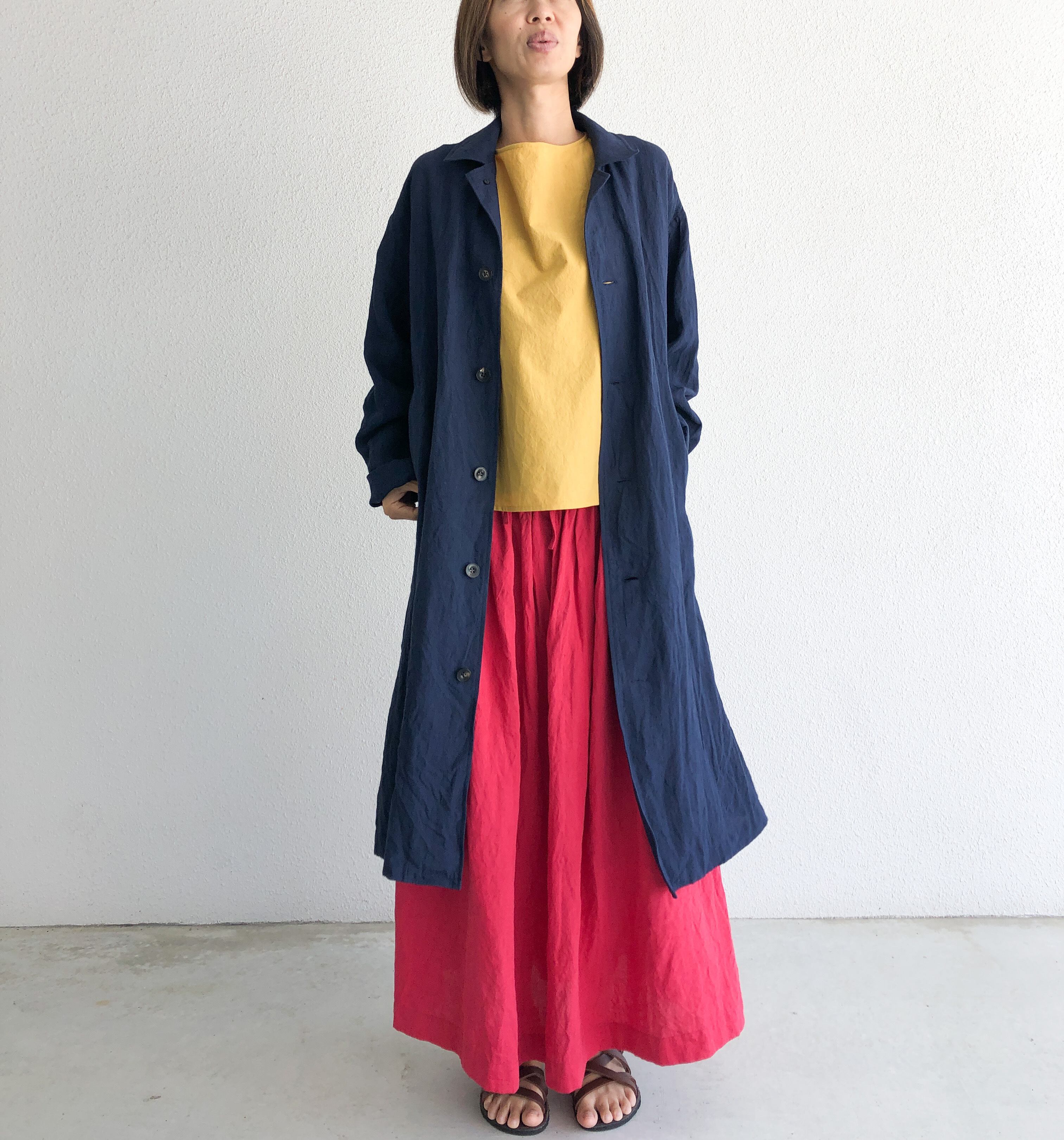 シンプルなデザインに表情のある素材を組み合わせて、着る度洗濯する度に表情が少しずつ変わりまた次も着たくなるサマーコートに仕上がっています。